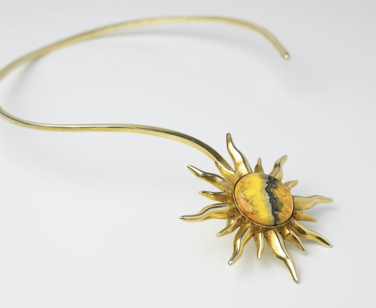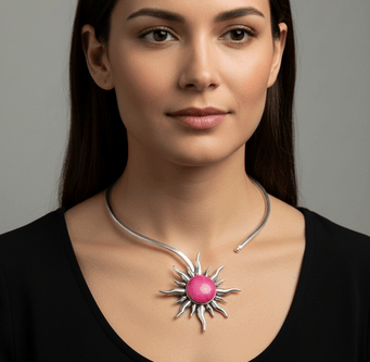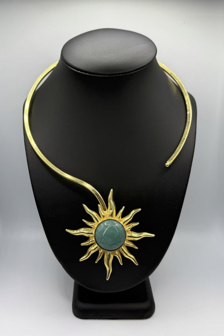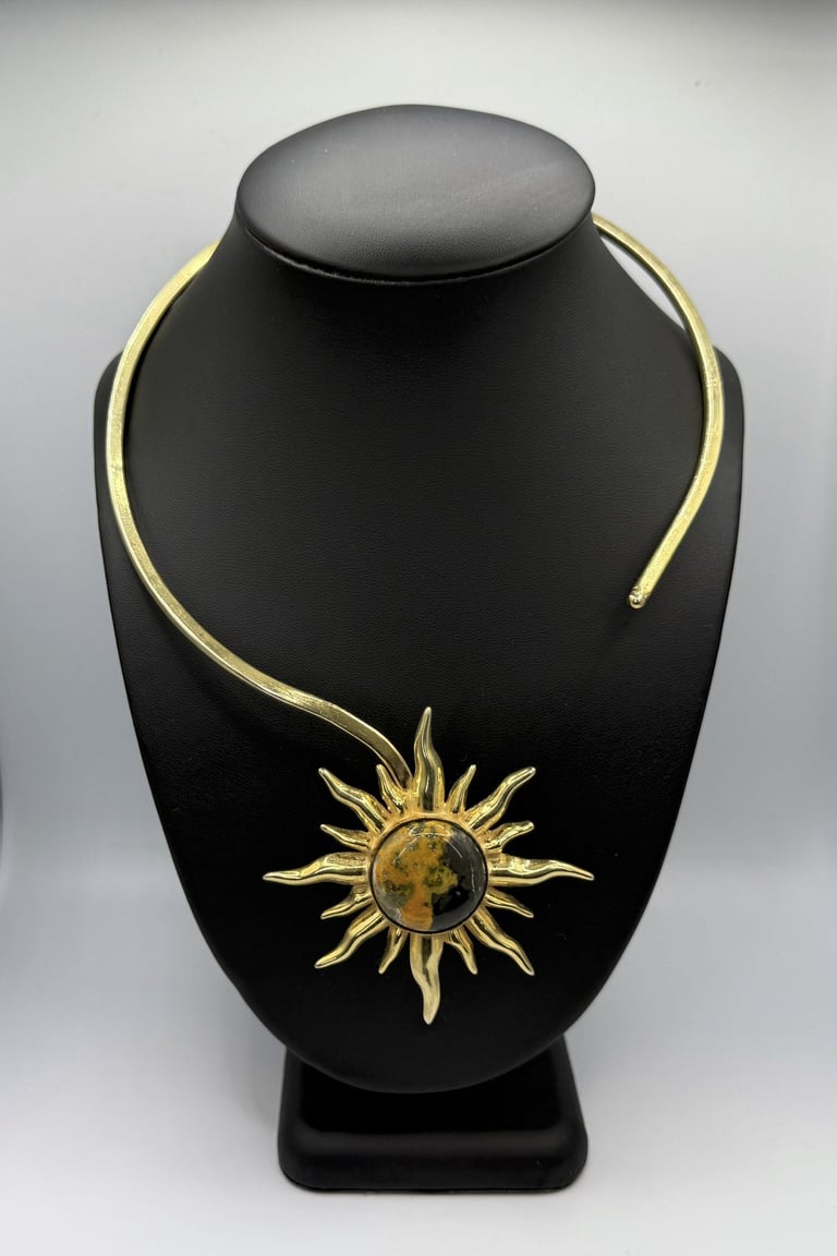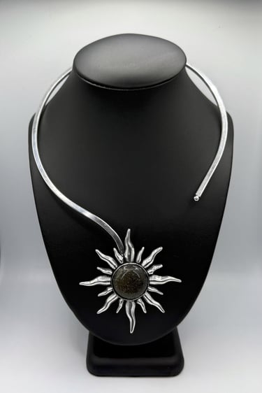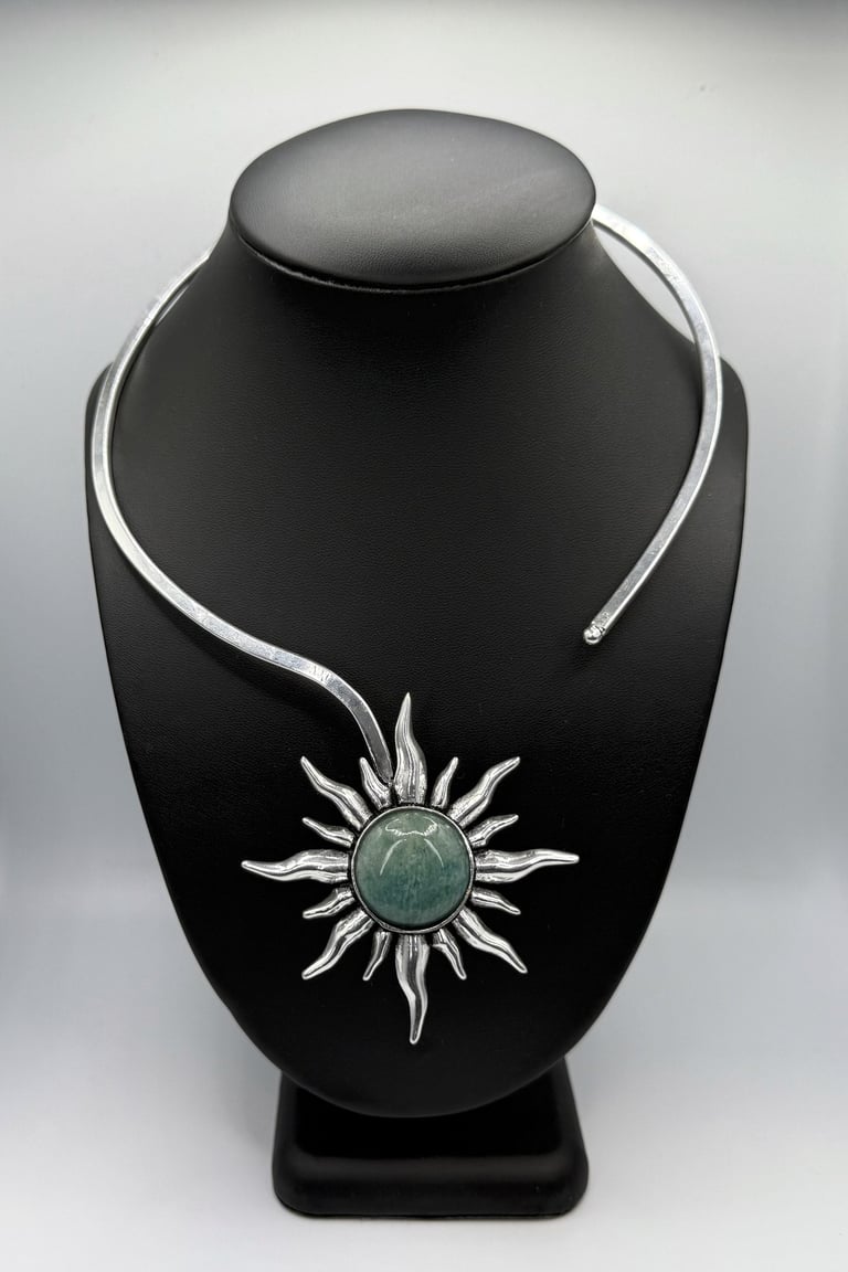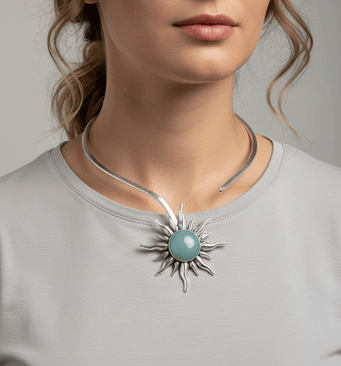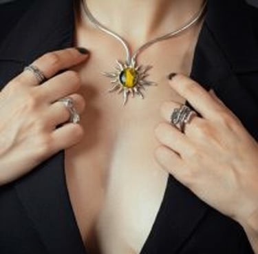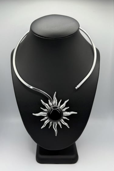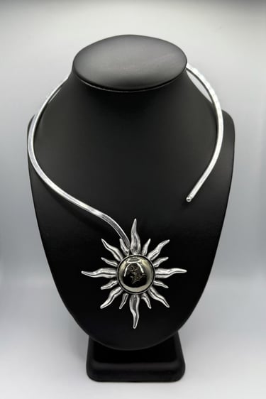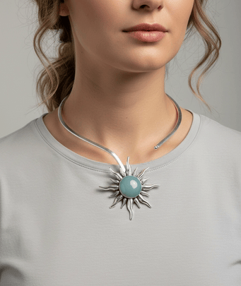 Discover your perfect cosmic match with our signature sunburst chokers in both luminous silver and rich gold. Featuring rare earth-inspired gemstones that bring ancient wisdom to modern style, these pieces celebrate the celestial dance between earth and sky. Each necklace is a wearable work of art that connects you to the universe's endless possibilities.
